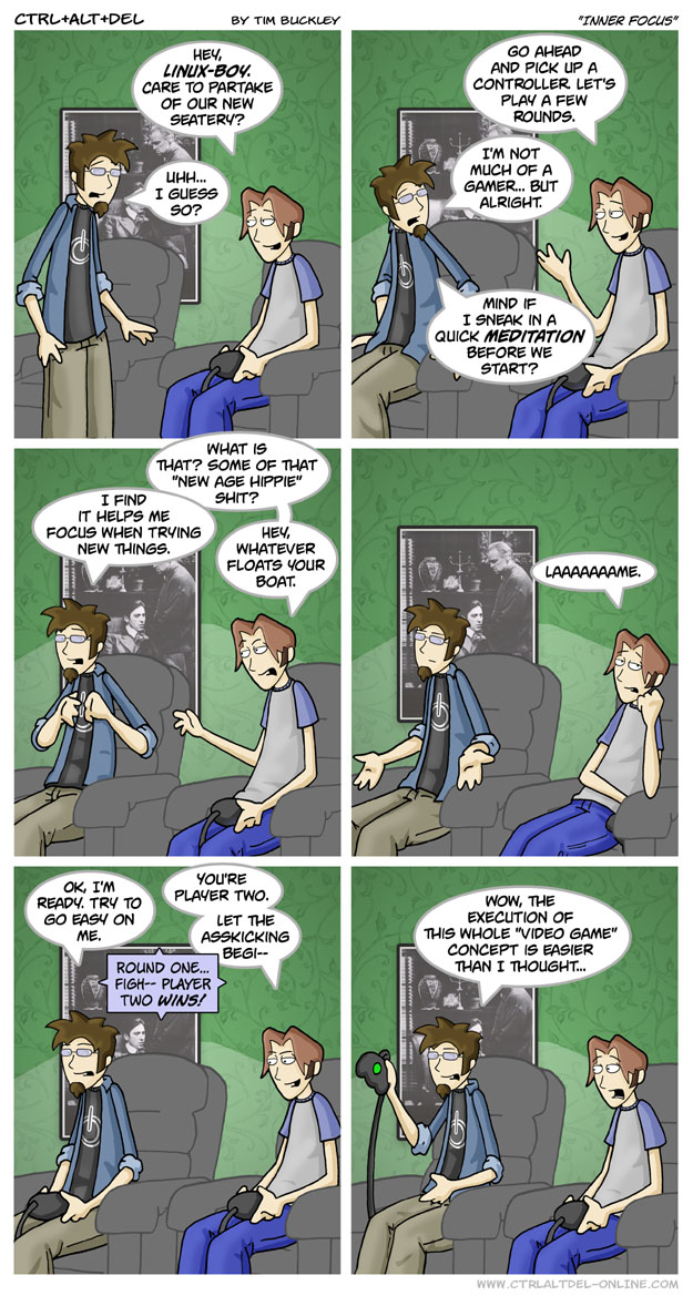 First Previous Random Next Last | 3 Share You are currently browsing the archive for Ctrl Alt Del First Previous Archive Random Next Last | 3 Share Tweet 24 Inner focus July 30, 2003 by Tim Subscribe Notify of new follow-up comments new replies to my comments Label {} [+] Name* Email* Δ Label {} [+] Name* Email* Δ 3 Comments Oldest Newest Most Voted Inline Feedbacks View all comments Hamstermer 8 years ago Let’s be honest here, Scott is an ace coder and has infiltrated Microsoft databases. Odds are he has memorized an instant win code for many games Ethan plays. Random guy 7 years ago Reply to Hamstermer Why do you give spoilers to people who are new to this comics? TIM THE TAT MAN 4 years ago Reply to Hamstermer yeah dude that is actually ball sacks