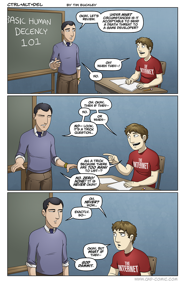 I will also point out that while such threats are definite in fact criminal, and thus never ok in any context and i wholly agree with the strip, having read a little more about the cases most recently I also do note I can understand that there is backlash. It is certain often voiced in a far overblown manner but I work in customer service. When complaints or issues are raised there is a serious protocol for handling them, with empathy and care, resolving or at least outlining why they cannot be resolved in a careful manner; to be told… Read more »
