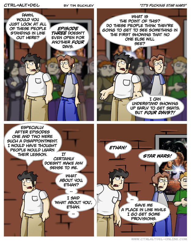 First Previous Random Next Last | 3 Share You are currently browsing the archive for Ctrl Alt Del First Previous Archive Random Next Last | 3 Share Tweet 24 It’s fucking Star Wars May 14, 2005 by Tim Subscribe Notify of new follow-up comments new replies to my comments Label {} [+] Name* Email* Δ Label {} [+] Name* Email* Δ 3 Comments Oldest Newest Most Voted Inline Feedbacks View all comments Doctor Disaster 5 years ago Not a lot of variety with the people in line, is there? I’m detecting a glitch in The Matrix. Shawn 5 years ago Back when Star Wars was worth seeing. DareFish 5 years ago Reply to Shawn The 80s?
