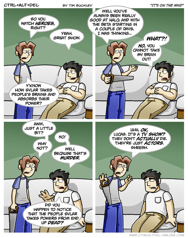First Previous Random Next Last | 4 Share You are currently browsing the archive for Ctrl Alt Del First Previous Archive Random Next Last | 4 Share Tweet 24 It’s on the mind May 14, 2007 by Tim Subscribe Notify of new follow-up comments new replies to my comments Label {} [+] Name* Email* Δ Label {} [+] Name* Email* Δ 4 Comments Oldest Newest Most Voted Inline Feedbacks View all comments MidnightDStroyer 7 years ago I don’t think I could live in the same household as Ethan. I wouldn’t be able to sleep. Ever. Poe-Etic 5 years ago I would love to live with Ethan. Quarantine would be alot more fun these days. I would love to see how his mind works during lockdown. Hmmmhmm 5 years ago Reply to Poe-Etic Don’t ever mention covid bs again Maximum 3 years ago Reply to Hmmmhmm Wtf Covid is a hot topic