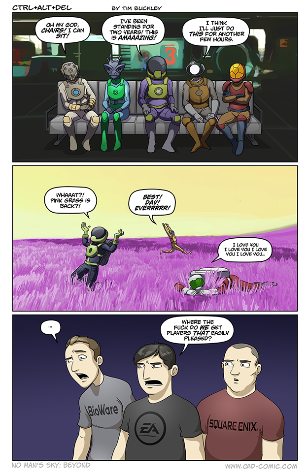 There is a Reddit post in the NMS subreddit about this comic. From the first comments: “Johnnyoneshot: One word… free. No dlc bullshit. No loot boxes or season pass. No devs reacting to the people complaining by calling them names. And a lot of people that have this game at number 1 on their top 5 list.” Also: “Racoonpuncher: Easily 90% of Beyond was never promised prior to release. VR, base changes, animal riding, the Nexus… Almost all of the last update (outside of QoL improvements and adjustments) was above and beyond what was promised for release. HG never promised… Read more »