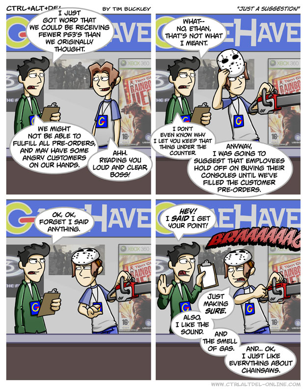 First Previous Random Next Last | 2 Share You are currently browsing the archive for Ctrl Alt Del First Previous Archive Random Next Last | 2 Share Tweet 24 Just a suggestion November 15, 2006 by Tim Subscribe Notify of new follow-up comments new replies to my comments Label {} [+] Name* Email* Δ Label {} [+] Name* Email* Δ 2 Comments Oldest Newest Most Voted Inline Feedbacks View all comments TIM THE TAT MAN 5 years ago yeah chainsaws are cool Sebastian 4 years ago I’m completely sure Ethan’s gonna love Chainsaw Man