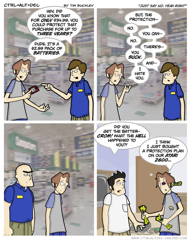 First Previous Random Next Last | 4 Share You are currently browsing the archive for Ctrl Alt Del First Previous Archive Random Next Last | 4 Share Tweet 24 Just say no. Yeah right December 2, 2002 by Tim Subscribe Notify of new follow-up comments new replies to my comments Label {} [+] Name* Email* Δ Label {} [+] Name* Email* Δ 4 Comments Oldest Newest Most Voted Inline Feedbacks View all comments Dingle Bloopynoop 4 years ago is anyone gonna call the legality of this into question, I’m no lawyer but I’m pretty sure that counts as assault Eldest Gruff 3 years ago Reply to Dingle Bloopynoop … it’s a comic strip. Do you write angry letters to Warner Brothers asking if they’ve considered that Bugs Bunny whacking Daffy Duck with a comically large mallet is assault? Robert 'CockRoach' Archer 1 year ago Reply to Eldest Gruff i know your joking/sarcastic but i wouldn’t put it past SOMEONE somewhere to have done this least once GiantHobbit7180 6 months ago Reply to Robert 'CockRoach' Archer The internet has ruined people. What we need to do? Take “Angry Karen” videos, and make TED Talk style reactions, then show those to the Karens.