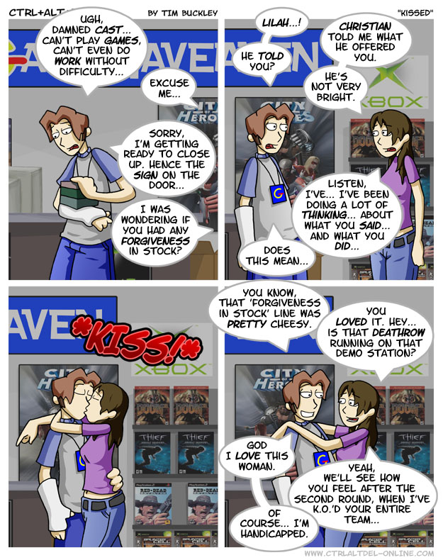 First Previous Random Next Last | 4 Share You are currently browsing the archive for Ctrl Alt Del First Previous Archive Random Next Last | 4 Share Tweet 24 Kissed May 10, 2004 by Tim Subscribe Notify of new follow-up comments new replies to my comments Label {} [+] Name* Email* Δ Label {} [+] Name* Email* Δ 4 Comments Oldest Newest Most Voted Inline Feedbacks View all comments israel saucedo 5 years ago God I missed this comic it always played the story perfectly El Guero Caliente 4 years ago I love this one — love it! But just one question… SINCE WHEN DO WOMEN APOLOGIZE WHEN THEY’VE MISJUDGED A GUY?!? J-Kitty 3 years ago Reply to El Guero Caliente That’s how you know you met the right woman. Tahiri 3 years ago One of the many examples of the world building I loved about this comic strip back in the day.