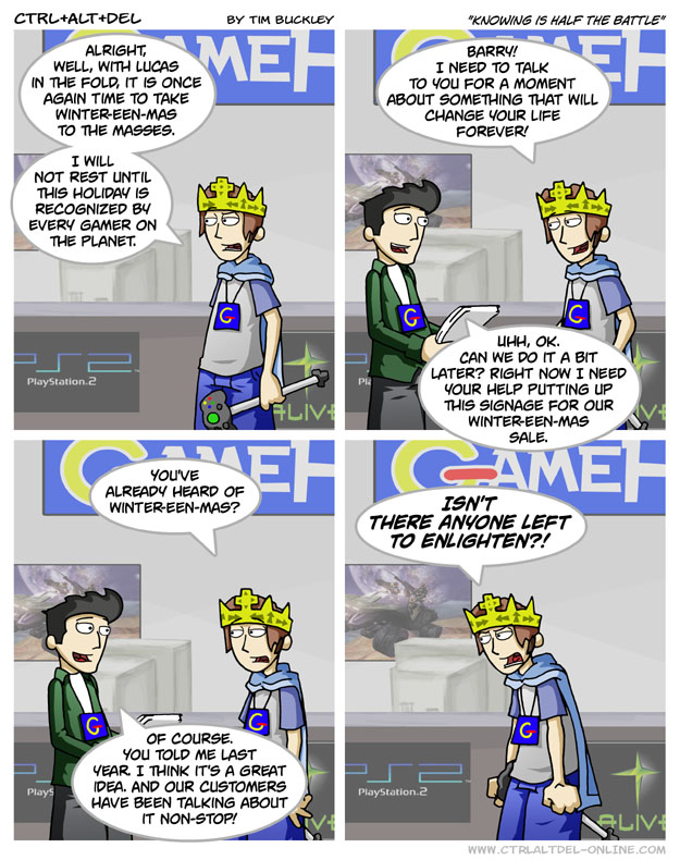 First Previous Random Next Last | 6 Share You are currently browsing the archive for Ctrl Alt Del First Previous Archive Random Next Last | 6 Share Tweet 24 Knowing is half the battle January 7, 2005 by Tim Subscribe Notify of new follow-up comments new replies to my comments Label {} [+] Name* Email* Δ Label {} [+] Name* Email* Δ 6 Comments Oldest Newest Most Voted Inline Feedbacks View all comments Arceus 7 years ago If my theory is correct. It should have already spread throughout the world by now. douglas 5 years ago my favourite holiday, is in fact winter-een-mas, and my boss knows it, so every year i gat jan 25 to the 31 off, without loosing sick days YeetusTheSecond 5 years ago Reply to douglas May the gods of gaming smile upon that man forever TIM THE TAT MAN 5 years ago Reply to douglas where do you work i must get there Maximum 3 years ago Reply to douglas Epic gamer moment Obama 4 years ago I love that this comic was posted the day before I was born