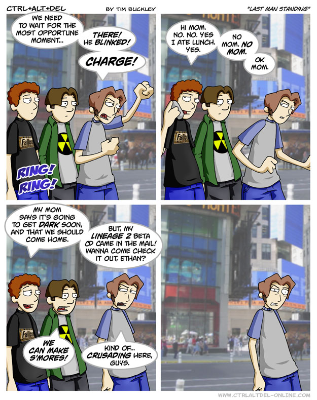 First Previous Random Next Last | 3 Share You are currently browsing the archive for Ctrl Alt Del First Previous Archive Random Next Last | 3 Share Tweet 24 Last man standing March 6, 2004 by Tim Subscribe Notify of new follow-up comments new replies to my comments Label {} [+] Name* Email* Δ Label {} [+] Name* Email* Δ 3 Comments Oldest Newest Most Voted Inline Feedbacks View all comments Hamstermer 8 years ago “I didn’t do it! I meant to burn it down but my chumps aren’t here, so I couldn’t have done it!” human 2 years ago Wait, what happened to the piss on the green jacket guy’s pants? Anton Sherwood 9 months ago Reply to human Very low humidity.