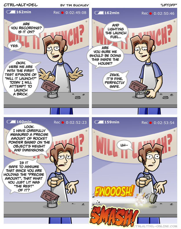 First Previous Random Next Last | 2 Share You are currently browsing the archive for Ctrl Alt Del First Previous Archive Random Next Last | 2 Share Tweet 24 Liftoff May 23, 2008 by Tim Subscribe Notify of new follow-up comments new replies to my comments Label {} [+] Name* Email* Δ Label {} [+] Name* Email* Δ 2 Comments Oldest Newest Most Voted Inline Feedbacks View all comments douglas 5 years ago the timers at the top don’t make sense Intrepyd45 4 years ago His battery drained 3 minutes in 4 seconds… this is why you don’t leave lithium rechargables plugged in indefinitely, the overheating kills them faster than constant use