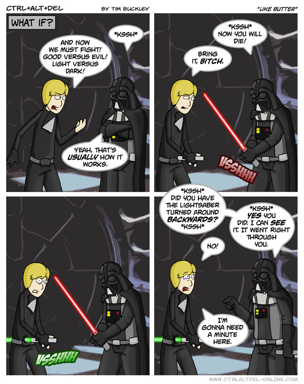 First Previous Random Next Last | 2 Share You are currently browsing the archive for Ctrl Alt Del First Previous Archive Random Next Last | 2 Share Tweet 24 Like butter July 7, 2003 by Tim Subscribe Notify of new follow-up comments new replies to my comments Label {} [+] Name* Email* Δ Label {} [+] Name* Email* Δ 2 Comments Oldest Newest Most Voted Inline Feedbacks View all comments Doctor Disaster 5 years ago On the plus side, the wound was instantly cauterized by the lightsaber. Intrepyd45 4 years ago Vader looks a whole lot better than his last appearance