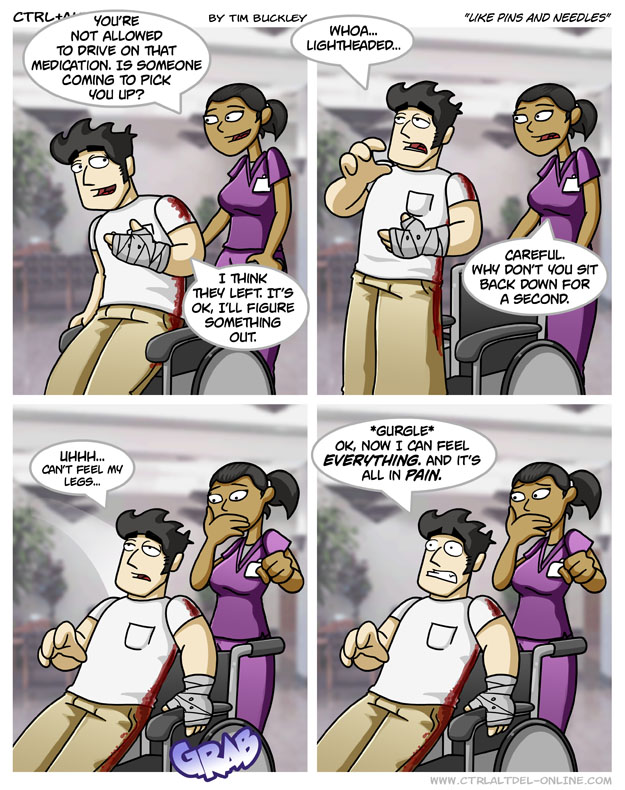 First Previous Random Next Last | 5 Share You are currently browsing the archive for Ctrl Alt Del First Previous Archive Random Next Last | 5 Share Tweet 24 Like pins and needles July 26, 2006 by Tim Subscribe Notify of new follow-up comments new replies to my comments Label {} [+] Name* Email* Δ Label {} [+] Name* Email* Δ 5 Comments Oldest Newest Most Voted Inline Feedbacks View all comments MidnightDStroyer 7 years ago Ummm, yeah…Pain killers have their limits unless they’re enough to knock you out, as in fully unconscious. I’ve even heard of the kind of pain that’s so intense that it forces someone awake because it’s the kind of pain that *will not be denied.* Stacts 5 years ago Reply to MidnightDStroyer I have literally been woken up by pain and been unable to go back to sleep. Kidney stones are a bitch That one n00b 1 year ago Reply to Stacts Similar experience for me, but instead of kidney stones, it was pulmonary embolisms for me. Not very fun. Doctor Disaster 5 years ago Reply to MidnightDStroyer That kind of pain will override every sense. 5tickman83 8 months ago Reply to MidnightDStroyer I’ve been woken up by toothache before (turned out my wisdom teeth were literally crushing my other teeth)