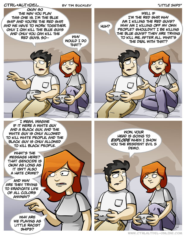First Previous Random Next Last | 3 Share You are currently browsing the archive for Ctrl Alt Del First Previous Archive Random Next Last | 3 Share Tweet 24 Little ships February 4, 2009 by Tim Subscribe Notify of new follow-up comments new replies to my comments Label {} [+] Name* Email* Δ Label {} [+] Name* Email* Δ 3 Comments Oldest Newest Most Voted Inline Feedbacks View all comments Arceus 7 years ago Oh yeah, I forgot that you kill infected Africans in that game. Reaper 5 years ago Reply to Arceus Racism! Poe-Etic 5 years ago RE5 is my favorite and I really wish I could see her head explode for that. It would be hilarious.