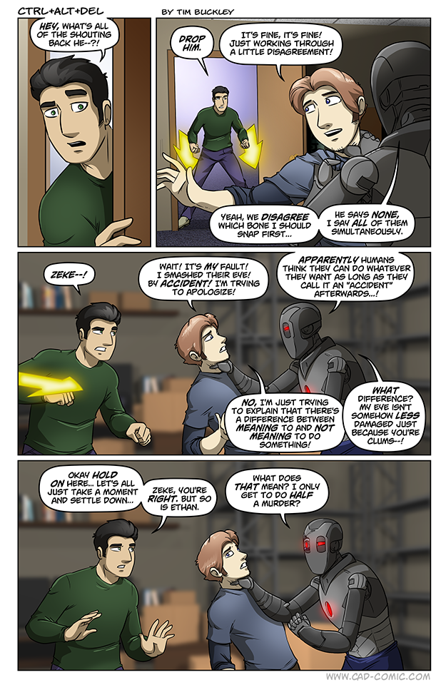 They need to setup a kangaroo court where Ethan can answer for his negligent damage to another sentient. Because he can’t be really killed for good, or otherwise jailed really, there ought to be some form of restorative justice. Maybe the bot gets to beat him up some. And again. And again. On the other hand, if the casing and other parts aren’t super hard to replace, it doesn’t have the same severity as it would for a human. It’s a quandry. Mind you, I’d have blown Zeke’s head off long ago and not taken any chances. Been bitten enough… Read more »