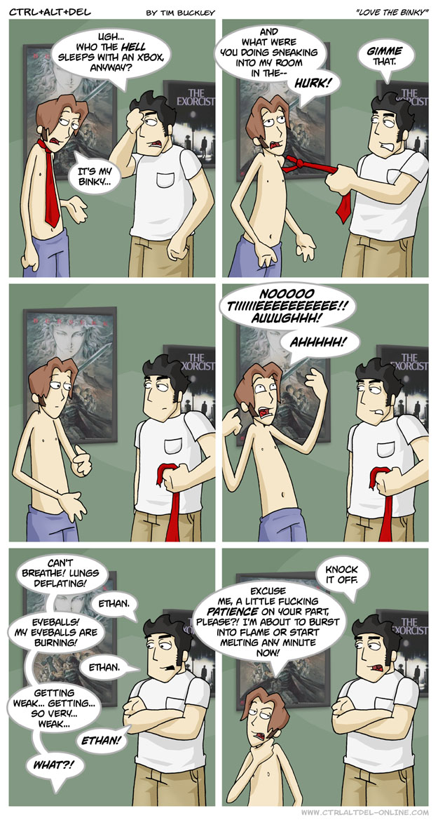 First Previous Random Next Last | 3 Share You are currently browsing the archive for Ctrl Alt Del First Previous Archive Random Next Last | 3 Share Tweet 24 Love the binky September 29, 2003 by Tim Subscribe Notify of new follow-up comments new replies to my comments Label {} [+] Name* Email* Δ Label {} [+] Name* Email* Δ 3 Comments Oldest Newest Most Voted Inline Feedbacks View all comments Hamstermer 7 years ago Honestly Lucas has a lot of physical strength to do that, most ties are pretty sturdy. Reaper 5 years ago Reply to Hamstermer If so, How did Ethan’s neck resist that much force?! drakestarkiller 7 years ago maybe he was just hoping it would strangle him