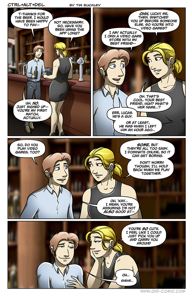 I was getting Dom-looking-for-Sub vibes last comic along with the initial red-flag of ordering over him, but you caught a couple of the further red flags in this one that I didn’t. As a generally-good guy, I don’t often think about predatory dating practices like fishing for competition and checking his dating competence. Scary stuff.