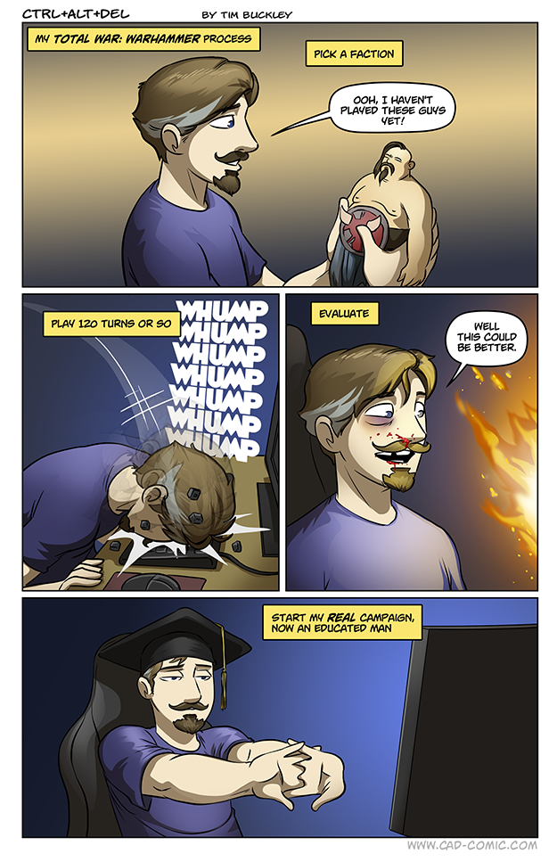 I can understand learning through practice in RTS, and even there 30-40min match is pretty lengthy for a test run. Trying to get a hold of a faction in TW takes a couple of evening from me. And more often than not I understand that this try is bad one and I sohuld restart, but I still don’t know what went wrong.
