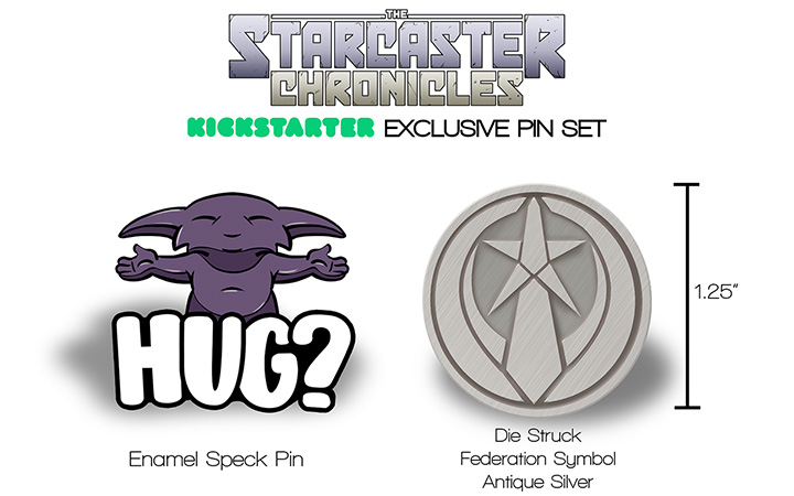 The Starcaster Chronicles Kickstarter Exclusive Pin Set, add-on, $9- The set includes two 1.25″ pins; a soft enamel color pin featuring everyone’s favorite acid-covered snuggle buddy and a silver die-struck Federation logo pin, like an Officer might wear on their lapel. Now available as an add-on to your Kickstarter pledge!