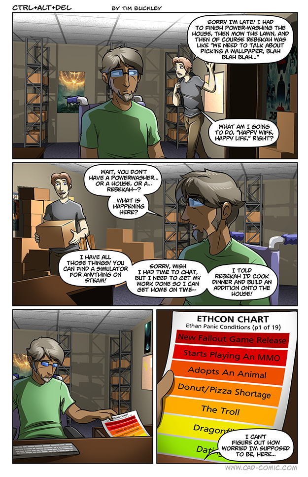Noooo. He’s showing up to work, talking to people, bathing, aware of the passage of time – all of which means he hasn’t hit MMO-levels of concern. Fallout would be him staging a full-on invasion of Bethesda.