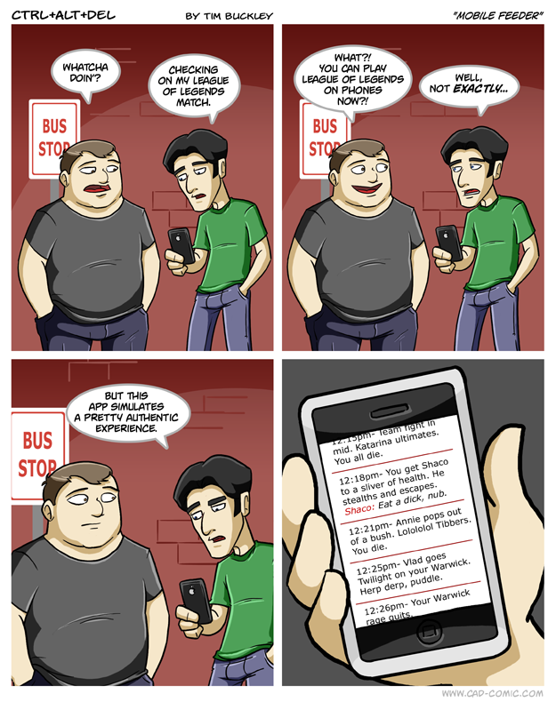 First Previous Random Next Last | 2 Share You are currently browsing the archive for Ctrl Alt Del First Previous Archive Random Next Last | 2 Share Tweet 24 Mobile feeder June 15, 2011 by Tim Subscribe Notify of new follow-up comments new replies to my comments Label {} [+] Name* Email* Δ Label {} [+] Name* Email* Δ 2 Comments Oldest Newest Most Voted Inline Feedbacks View all comments Him. 7 years ago I don’t get it, isn’t that basically just LoL without graphics? What’s so different? bree 5 years ago Reply to Him. That’s…. That’s the joke bud.