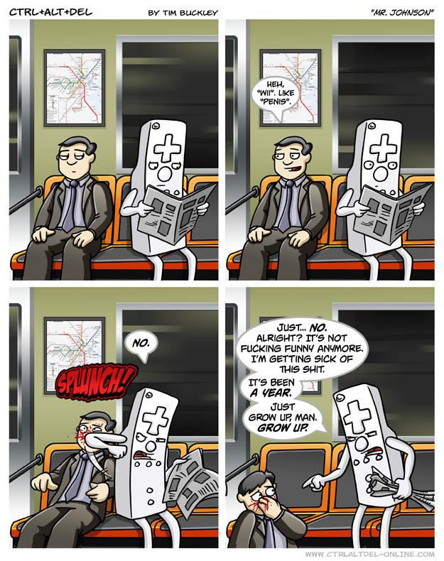 First Previous Random Next Last | 7 Share You are currently browsing the archive for Ctrl Alt Del First Previous Archive Random Next Last | 7 Share Tweet 24 Mr. Johnson March 26, 2007 by Tim Subscribe Notify of new follow-up comments new replies to my comments Label {} [+] Name* Email* Δ Label {} [+] Name* Email* Δ 7 Comments Oldest Newest Most Voted Inline Feedbacks View all comments MidnightDStroyer 7 years ago IF you have 3 of them sitting in a row, then it’s the last little piggy that goes Wii, Wii, Wii all the way home. Beer Guide 6 years ago Is that the MBTA map in the back? 🙂 ACK! 4 years ago Reply to Beer Guide Appear to have been some changes in the 14 years since this was drawn, but I think you’re right. https://cdn.mbta.com/sites/default/files/2021-05/subway-map-may-2021-GLX-stops.pdf douglas 5 years ago i don’t get the joke Verycool 1 year ago Reply to douglas Wii like wee like pee Poe-Etic 5 years ago Ha. Intrepyd45 4 years ago Never saw a peen destroy a flatscreen like I have a wiimote. A broken nose is getting off light