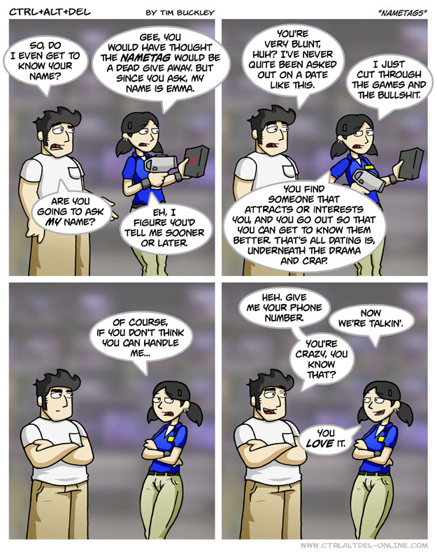 First Previous Random Next Last | 4 Share You are currently browsing the archive for Ctrl Alt Del First Previous Archive Random Next Last | 4 Share Tweet 24 Nametags March 16, 2005 by Tim Subscribe Notify of new follow-up comments new replies to my comments Label {} [+] Name* Email* Δ Label {} [+] Name* Email* Δ 4 Comments Oldest Newest Most Voted Inline Feedbacks View all comments Somewhere 8 years ago Next thing you know she’ll be asking for money and threatening to kill you! Random guy 7 years ago Reply to Somewhere YOU SHOULD PUT SPOILER ALERT. SORRY FOR CAPS I CANT TURN THEM OFF douglas 5 years ago Reply to Random guy how do you turn the OH GOD HELP ME 12345cow 4 years ago Reply to douglas HAHAHAHAHAAH…ha heh…