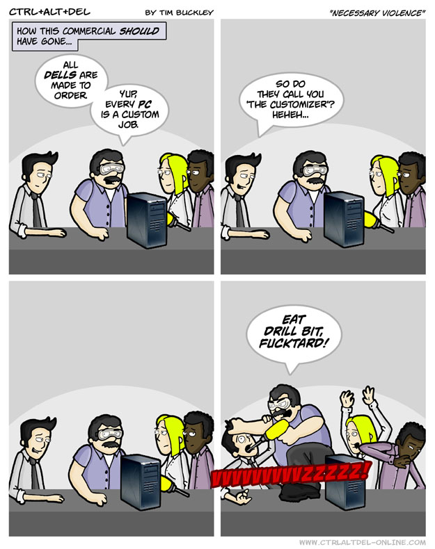 First Previous Random Next Last | 1 Share You are currently browsing the archive for Ctrl Alt Del First Previous Archive Random Next Last | 1 Share Tweet 24 Necessary Violence April 11, 2003 by Tim Subscribe Notify of new follow-up comments new replies to my comments Label {} [+] Name* Email* Δ Label {} [+] Name* Email* Δ 1 Comment Oldest Newest Most Voted Inline Feedbacks View all comments Intrepyd45 4 years ago This reimagining of said ads is what convinced me to get a Dell back then. Thanks, Tim!