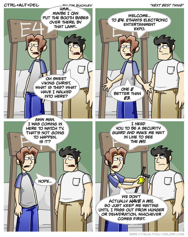 First Previous Random Next Last | 4 Share You are currently browsing the archive for Ctrl Alt Del First Previous Archive Random Next Last | 4 Share Tweet 24 Next best thing August 18, 2006 by Tim Subscribe Notify of new follow-up comments new replies to my comments Label {} [+] Name* Email* Δ Label {} [+] Name* Email* Δ 4 Comments Oldest Newest Most Voted Inline Feedbacks View all comments Hamstermer 8 years ago It’s a good deal. I promise. MidnightDStroyer 7 years ago Well hey, once Ethan passes out, Lucas can watch TV. Win – win. Peter Pedant 6 years ago Reply to MidnightDStroyer And he’s given a nightstick with which to accelerate the process Maximum 3 years ago Every event I go to be like: