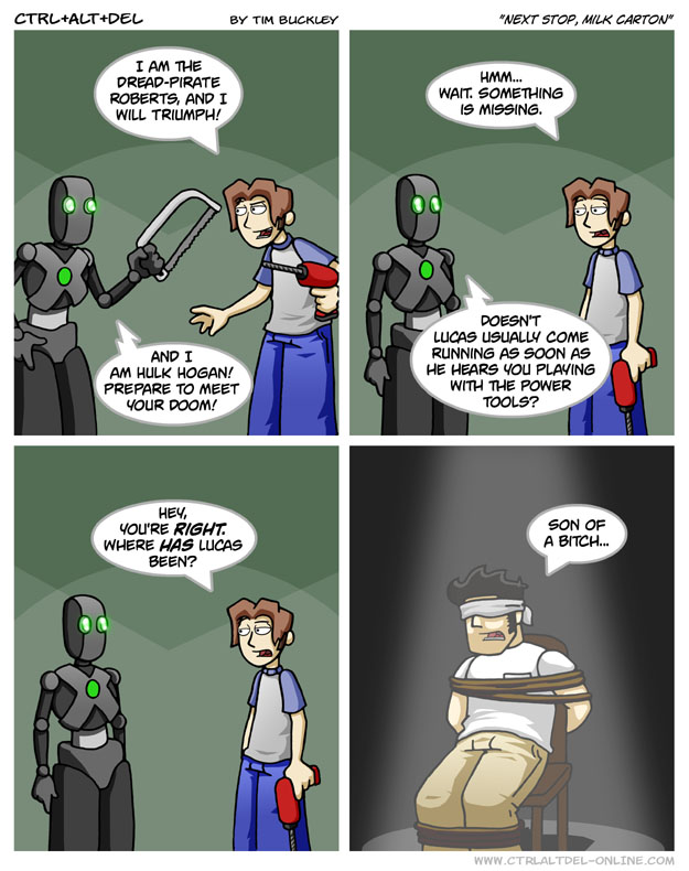 First Previous Random Next Last | 1 Share You are currently browsing the archive for Ctrl Alt Del First Previous Archive Random Next Last | 1 Share Tweet 24 Next stop, milk carton April 29, 2005 by Tim Subscribe Notify of new follow-up comments new replies to my comments Label {} [+] Name* Email* Δ Label {} [+] Name* Email* Δ 1 Comment Oldest Newest Most Voted Inline Feedbacks View all comments Random guy 7 years ago Lucas Has the sixth sense. Sense for knowing if Ethan is playing with power tools