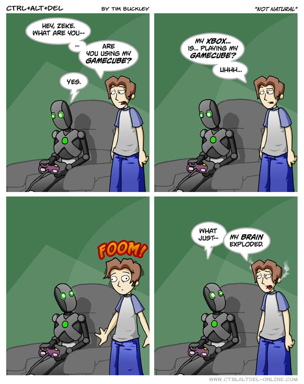 First Previous Random Next Last | 7 Share You are currently browsing the archive for Ctrl Alt Del First Previous Archive Random Next Last | 7 Share Tweet 24 Not natural February 23, 2005 by Tim Subscribe Notify of new follow-up comments new replies to my comments Label {} [+] Name* Email* Δ Label {} [+] Name* Email* Δ 7 Comments Oldest Newest Most Voted Inline Feedbacks View all comments Hamstermer 8 years ago Wait, Ethan has a brain? jonisnotameme 7 years ago Reply to Hamstermer This… this is too much for me to process… *my brain explodes* My family: “Wait, he has a brain??” MidnightDStroyer 7 years ago Reply to jonisnotameme I notice that it wasn’t even enough to blow his nose… Random guy 7 years ago Reply to MidnightDStroyer Well of course. It’s Ethan Kasaix 7 years ago What has science (Ethan) done?! Doctor Disaster 5 years ago Would we file this under cross-platform gaming? That one n00b 1 year ago Suddenly I have that seen from Jurassic Park in my head where Jeff Goldblum mentioned the scientists were too preoccupied with if they could do something they didn’t stop to think if they should.