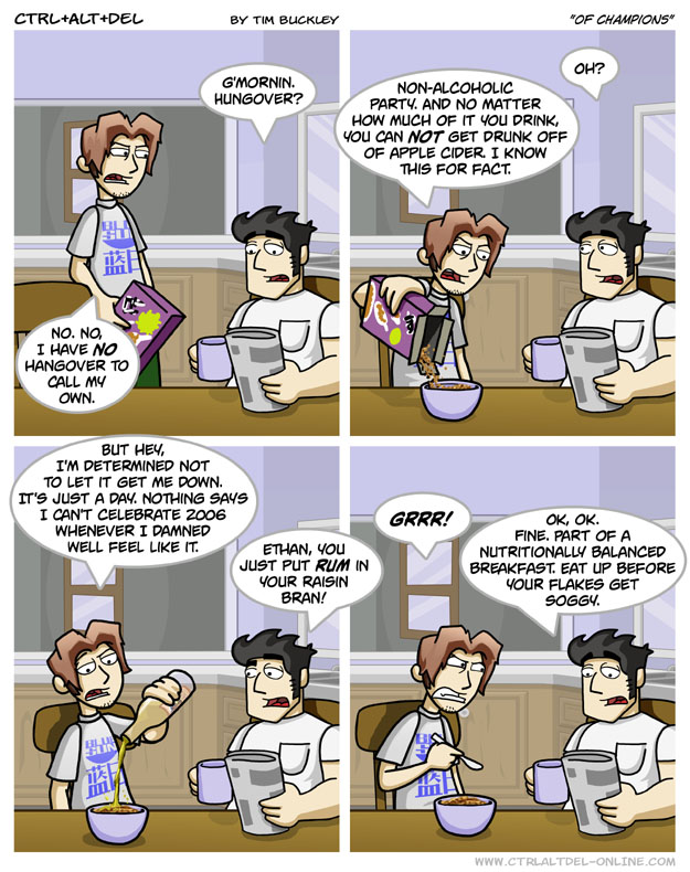 First Previous Random Next Last | 3 Share You are currently browsing the archive for Ctrl Alt Del First Previous Archive Random Next Last | 3 Share Tweet 24 Of champions January 2, 2006 by Tim Subscribe Notify of new follow-up comments new replies to my comments Label {} [+] Name* Email* Δ Label {} [+] Name* Email* Δ 3 Comments Oldest Newest Most Voted Inline Feedbacks View all comments Anonymous 5 years ago Love the Firefly t-shirt 🙂 ACK! 4 years ago You can if it’s real cider, i.e. not contaminated with preservatives. leduk 1 year ago you 100% can get drunk of apple cider tho