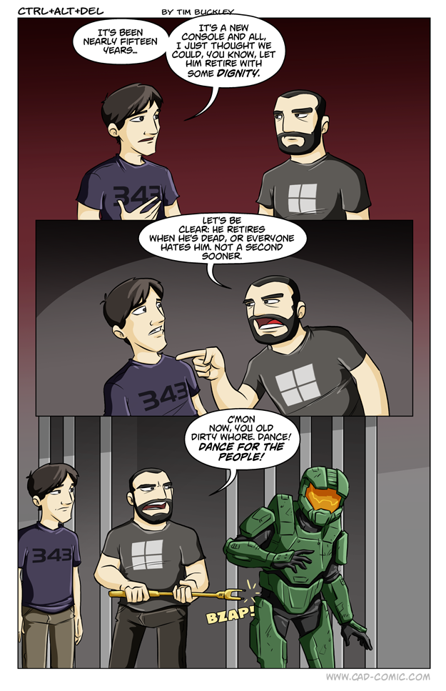 First Previous Random Next Last | 2 Share You are currently browsing the archive for Ctrl Alt Del First Previous Archive Random Next Last | 2 Share Tweet 24 Old horse October 15, 2014 by Tim Subscribe Notify of new follow-up comments new replies to my comments Label {} [+] Name* Email* Δ Label {} [+] Name* Email* Δ 2 Comments Oldest Newest Most Voted Inline Feedbacks View all comments Puretra 5 years ago Lmaooooooo Cakexifx 1 year ago It would be a cool addition if he poked him with the Halo energy sword