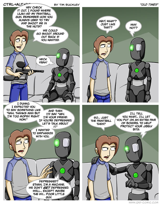First Previous Random Next Last | 6 Share You are currently browsing the archive for Ctrl Alt Del First Previous Archive Random Next Last | 6 Share Tweet 24 Old times November 8, 2010 by Tim Subscribe Notify of new follow-up comments new replies to my comments Label {} [+] Name* Email* Δ Label {} [+] Name* Email* Δ 6 Comments Oldest Newest Most Voted Inline Feedbacks View all comments Hamstermer 8 years ago Not the Wii. The Wii U gets depressed. Or it would if it was used enough to discern depression. MidnightDStroyer 7 years ago At least Zeke didn’t get the same “personality profile” as Marvin did. Hamstermer 7 years ago Reply to MidnightDStroyer Zeke only has a brain the size of a dwarf planet. …its connected to the Cloud. Poe-Etic 5 years ago ha….”jibbly bits” Yeet2 5 years ago Reply to Poe-Etic I prefer to call them my “oompa loompas” camypaj 3 years ago haha, “emphasize” for the win 🙂 Tim for president.. of everything! 🙂 I’m still laughing my a** off..