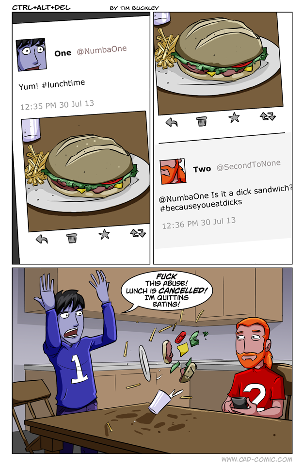First Previous Random Next Last | 5 Share You are currently browsing the archive for Ctrl Alt Del First Previous Archive Random Next Last | 5 Share Tweet 24 One-forty July 31, 2013 by Tim Subscribe Notify of new follow-up comments new replies to my comments Label {} [+] Name* Email* Δ Label {} [+] Name* Email* Δ 5 Comments Oldest Newest Most Voted Inline Feedbacks View all comments Hamstermer 8 years ago ABUSE GARLFASDVNOAVSD -Excerpt from the minds of the alleged “Trump Hate Comic” commenters. Sarcastic or not is up to you. Him. 7 years ago What exactly is the 1:40 referring to…? Kasaix 4 years ago Some further context for this can be found on the wayback machine https://web.archive.org/web/20130804031954/http://www.cad-comic.com/cad/20130731 TuwitE 4 years ago Reply to Kasaix Further context for…? Taylor 3 years ago Reply to Kasaix Oh my God. I never thought of using the way back machine so that I could read Tim’s extra comments from when these were first posted. Next time I’m re-reading the series, I’ll definitely be doing that way.