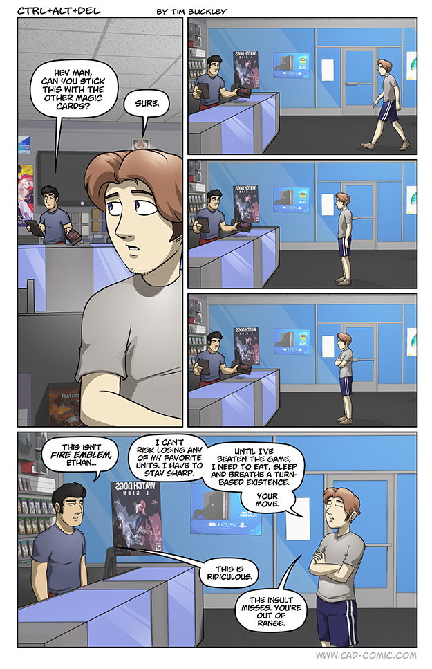 Wait, I thought he hated JRPGs? Possibilities abound! 1) He started trying jrpgs to impress Emily. He’s still trying some in case they get back together. 2) He jumped on the new Fire Emblem game because despite constantly mocking the mainstream stores, he’s a slut for whatever the current ‘in’ game is. Will next page be Lucas informing him that there’s an entire franchise? 3) He has a really weird and hipster-geek definition of gaming genres. In his mind ‘jrpg’ just describes any rpg he doesn’t like. 4) He still doesn’t like jrpgs in general, but a good game is… Read more »