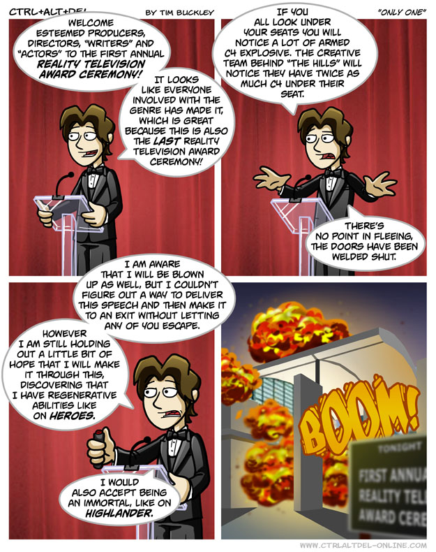 First Previous Random Next Last | 5 Share You are currently browsing the archive for Ctrl Alt Del First Previous Archive Random Next Last | 5 Share Tweet 24 Only one November 17, 2007 by Tim Subscribe Notify of new follow-up comments new replies to my comments Label {} [+] Name* Email* Δ Label {} [+] Name* Email* Δ 5 Comments Oldest Newest Most Voted Inline Feedbacks View all comments Kasaix 7 years ago The ideal finale for every reality show ever made. MidnightDStroyer 7 years ago Reply to Kasaix It doesn’t get any more real than this. Him. 7 years ago Reply to MidnightDStroyer And still, no one goes to the bathroom except for as a plot device GUNNibal 3 years ago Soooo, can we assume that whoever got the biggest C4 package under their seat won the award? Or is it whoever made the highest in the air..? That one n00b 1 year ago Reply to GUNNibal Whoever made the most pieces.