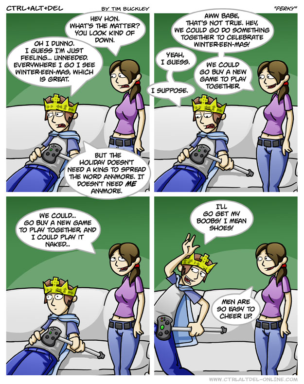 First Previous Random Next Last | 7 Share You are currently browsing the archive for Ctrl Alt Del First Previous Archive Random Next Last | 7 Share Tweet 24 Perky January 7, 2006 by Tim Subscribe Notify of new follow-up comments new replies to my comments Label {} [+] Name* Email* Δ Label {} [+] Name* Email* Δ 7 Comments Oldest Newest Most Voted Inline Feedbacks View all comments MidnightDStroyer 7 years ago I agree. Boobs make *everything* better. Arceus 7 years ago Reply to MidnightDStroyer I concur douglas 5 years ago Reply to MidnightDStroyer except pokemon and men Doctor Disaster 5 years ago Reply to douglas Does this username better suit your tastes? TuwitE 4 years ago Reply to Doctor Disaster I hope not, because, uhhh, my birthrate is douglas TIM THE TAT MAN 4 years ago Reply to MidnightDStroyer yes Poe 5 years ago Boobs definitely make everything better.