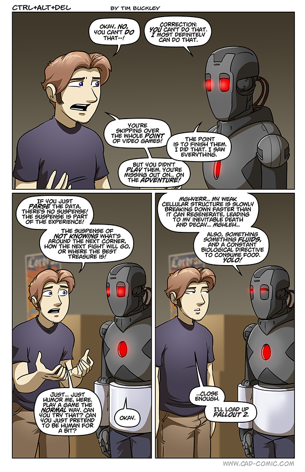 After buying a girl’s freedom from raiders in the early part of Fallout 1, I returned to the raiders and methodically filled all of them with lead. The leader of course needed way more than that, partly because he could one-shot me with ease. Of all the luck, I critical-shot him so bad he fell flat on his face long enough to be given both grenades I had; and EVEN THEN he got up just in time for me to critical-shoot him one last time, and only then he died. God bless save-scumming. I love the fact that this fictional… Read more »