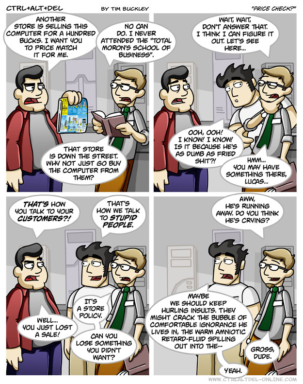 First Previous Random Next Last | 4 Share You are currently browsing the archive for Ctrl Alt Del First Previous Archive Random Next Last | 4 Share Tweet 24 Price check? April 7, 2006 by Tim Subscribe Notify of new follow-up comments new replies to my comments Label {} [+] Name* Email* Δ Label {} [+] Name* Email* Δ 4 Comments Oldest Newest Most Voted Inline Feedbacks View all comments Shawn 5 years ago If this panel were written today, it’d be followed by a month-long arc where Lucas and his boss get taken to court for causing PTSD or some equally snowflakey crap. Hmmmhmm 5 years ago Reply to Shawn Dude you sound like you’re from 2015, enough of this boring “haha I hate sjws” crap. Richard Weatherfield 3 years ago Reply to Hmmmhmm Sounds like something an SJW would say. 😛 Jamie 3 years ago Reply to Shawn *he said, triggered by a word in a comic* put the outrage away for a sec, enjoy some more quality comics