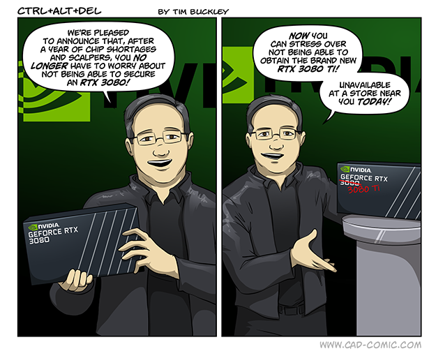 I know your memeing , but the biggest reason they are trying to push the 3080TI is because it takes almost half the memory and modules as a 3090. They can build nearly 2 3080TI’s with what is in the 3090 so this is their way of trying to help production. LTT Talks a bit about it on their channel (and I’m pretty sure they are company stock holders in the meetings?)
