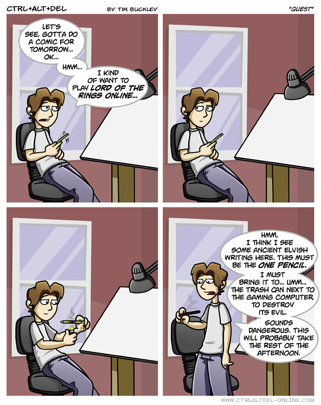 First Previous Random Next Last | 2 Share You are currently browsing the archive for Ctrl Alt Del First Previous Archive Random Next Last | 2 Share Tweet 24 Quest June 15, 2007 by Tim Subscribe Notify of new follow-up comments new replies to my comments Label {} [+] Name* Email* Δ Label {} [+] Name* Email* Δ 2 Comments Oldest Newest Most Voted Inline Feedbacks View all comments Him. 7 years ago But beware, because as you carry the One Pencil its might may corrode your very soul. Kasaix 3 years ago I strongly want to believe this is based on a true story and Tim used a lighter on a pencil just to play Lord of the Rings Online.