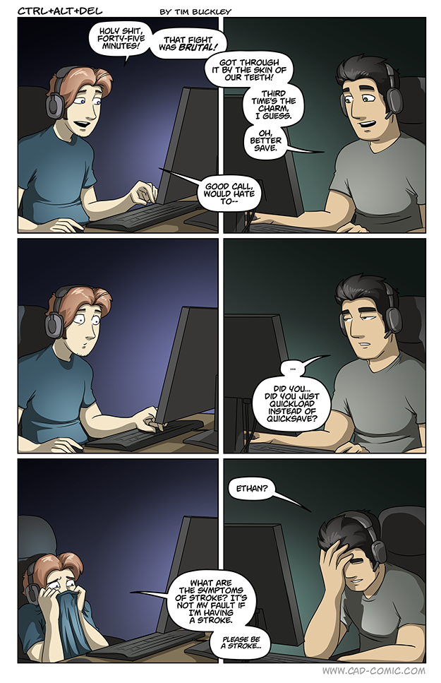 This is why I go into the save menu proper. While the system does its thing, sit back, stretch the fingers, relax the brain for a second. Mental exhaustion is the primary cause of gamer death…. and also the primary cause of typos, mixing up the quicksave/load keys.