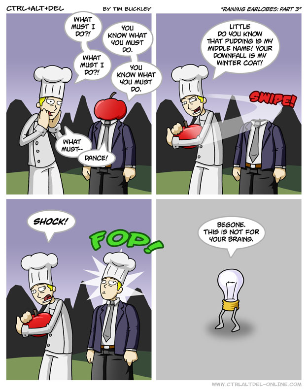 First Previous Random Next Last | 5 Share You are currently browsing the archive for Ctrl Alt Del First Previous Archive Random Next Last | 5 Share Tweet 24 Raining earlobes: Part 3 September 24, 2004 by Tim Subscribe Notify of new follow-up comments new replies to my comments Label {} [+] Name* Email* Δ Label {} [+] Name* Email* Δ 5 Comments Oldest Newest Most Voted Inline Feedbacks View all comments MidnightDStroyer 7 years ago But my brains CAN handle tomato sauce on my maple pancakes. douglas 5 years ago Reply to MidnightDStroyer wait, that’s illegal Doctor Disaster 5 years ago Reply to douglas Is it? BrokenBanette 7 years ago begone thot Kasaix 10 months ago But what does it all mean?