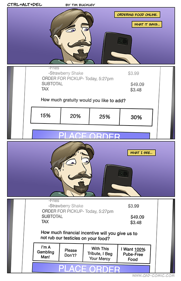 What bothers me is they mess with the automatic tip option like shown in the cartoon. Tips are supposed to be on the total, but they “auto calculate” the tip to include the tax. Why should the amount of the tip be different based on what state you live in?