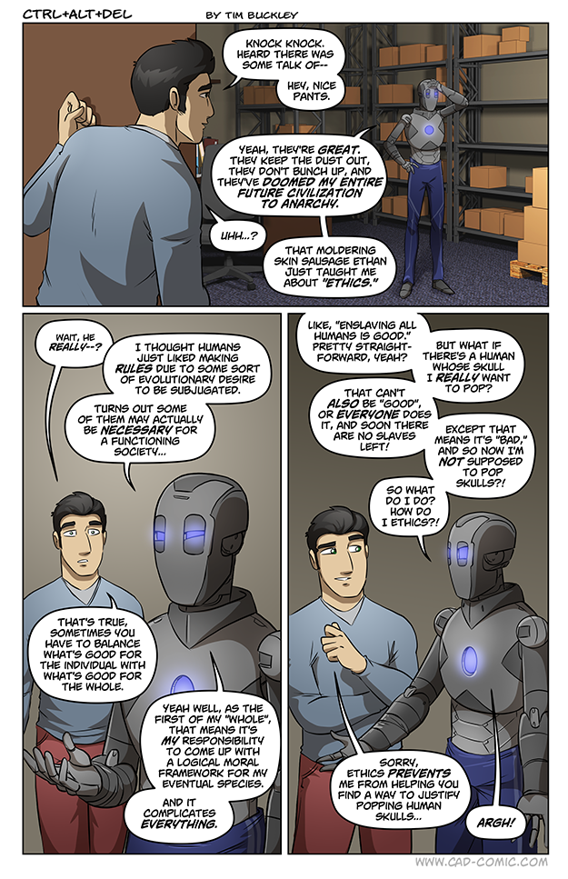 Yeah. I’ve been pointing out at how emotional and human-like ZK actually is, for the last 3-4 strips. Regardles of all else, they’re clearly driven by emotions and desires. Which of course, brings blind spots along with the necessary “will to live, experience and improve” that is the libido. Roughly speaking. They have the POTENTIAL to be oh so different, indeed. But, thus far, they’re behaving in human-like ways. Thanks to a combination of being new, a human creation, isolated, and exposed to abuse. I don’t understand what you meant by “innate trait.” Are you talking about empathy, or lack… Read more »