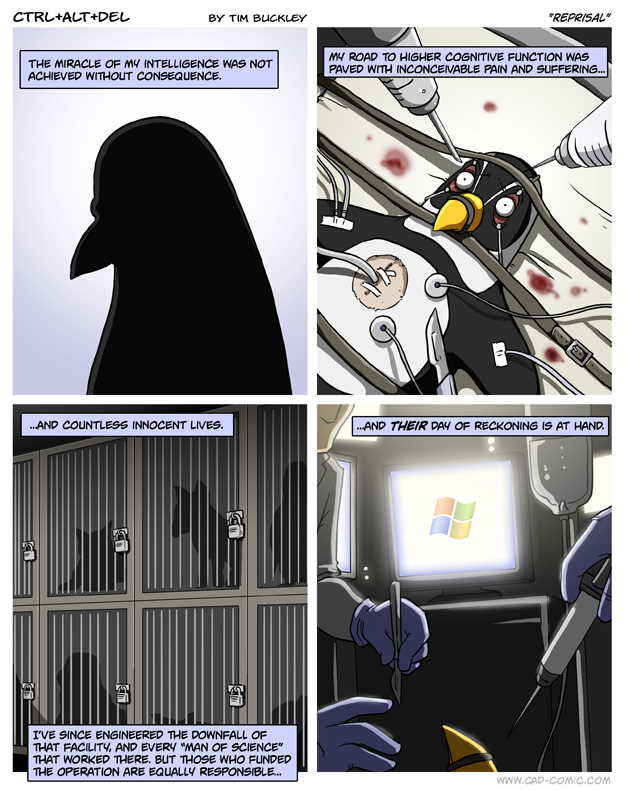 First Previous Random Next Last | 1 Share You are currently browsing the archive for Ctrl Alt Del First Previous Archive Random Next Last | 1 Share Tweet 24 Reprisal September 5, 2011 by Tim Subscribe Notify of new follow-up comments new replies to my comments Label {} [+] Name* Email* Δ Label {} [+] Name* Email* Δ 1 Comment Oldest Newest Most Voted Inline Feedbacks View all comments Him. 7 years ago To be clear, it was just a company that used Microsoft products. It was the first thing Ted saw as a sentient being