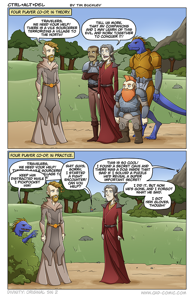 I remember while Playing Divinity Original Sin with a friend, when he would be picking up the quest I’d spend my time stealing everything that isn’t nailed down while the NPC was busy talking with him.