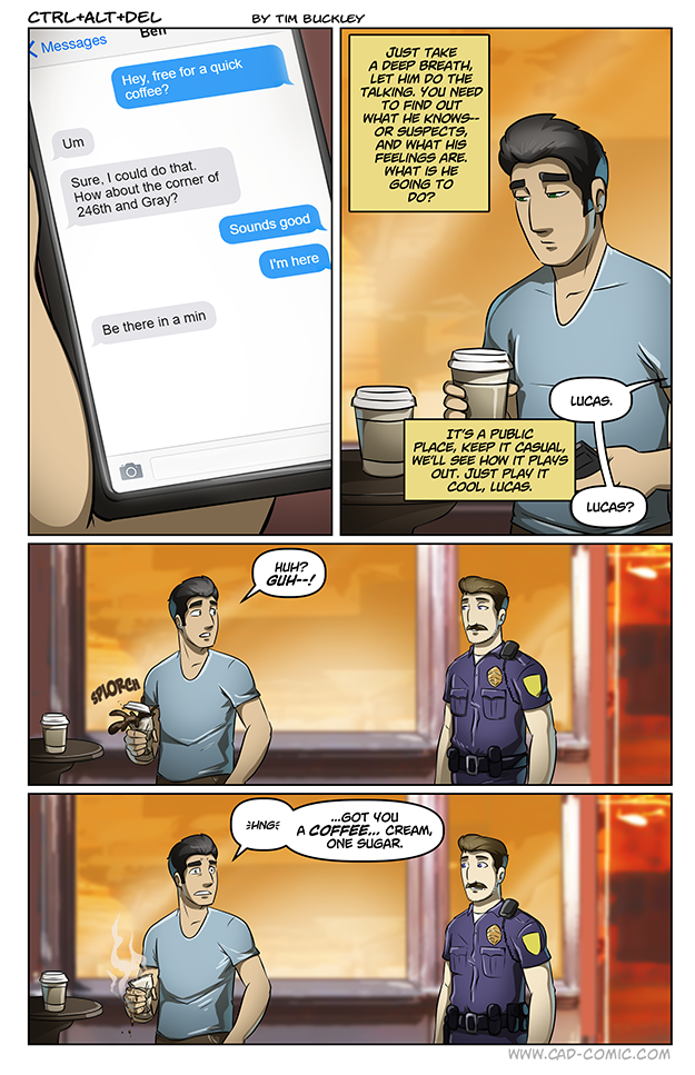 Lucas knows Ben is a cop. Coffee is more an early or middle of the day thing when they’ve mostly been hanging out evenings. Common sense is a super power he apparently lacks.