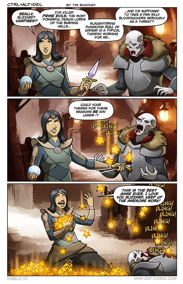 I enjoyed D4 enough at launch, but burned out really quickly when Season One rolled around. It was just so… bleh. Grindy, dull, uninspired. Everything felt slowed way down, and the whole “Ooh it’s a bunch of enemies you usually fight, but now they’re CORRUUUUPTED” thing was such a snoozefest. And similarly, I find Season 2’s vampires equally boring as an antagonist.