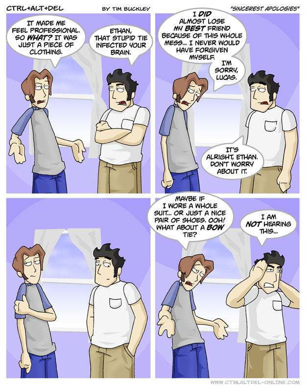 First Previous Random Next Last | 5 Share You are currently browsing the archive for Ctrl Alt Del First Previous Archive Random Next Last | 5 Share Tweet 24 Sincerest apologies October 1, 2003 by Tim Subscribe Notify of new follow-up comments new replies to my comments Label {} [+] Name* Email* Δ Label {} [+] Name* Email* Δ 5 Comments Oldest Newest Most Voted Inline Feedbacks View all comments MidnightDStroyer 7 years ago “Bow ties are cool.” ~The Doctor TIM THE TAT MAN 4 years ago Reply to MidnightDStroyer yes they are Patrick Bissonette 4 years ago Reply to MidnightDStroyer Wibbly-wobbly timey-wimey… stuff Metatetrol 4 years ago Reply to Patrick Bissonette Yes, but that was said by The Doctor, not The Doctor Chris Jacka 4 years ago Reply to Metatetrol That makes perfect sense to a Dr Who fan. Lol