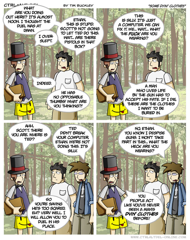 First Previous Random Next Last | 1 Share You are currently browsing the archive for Ctrl Alt Del First Previous Archive Random Next Last | 1 Share Tweet 24 Some dyin’ clothes May 28, 2004 by Tim Subscribe Notify of new follow-up comments new replies to my comments Label {} [+] Name* Email* Δ Label {} [+] Name* Email* Δ 1 Comment Oldest Newest Most Voted Inline Feedbacks View all comments Dingle Bloopynoop 4 years ago I suddenly feel my respect for scott slipping after that last panel