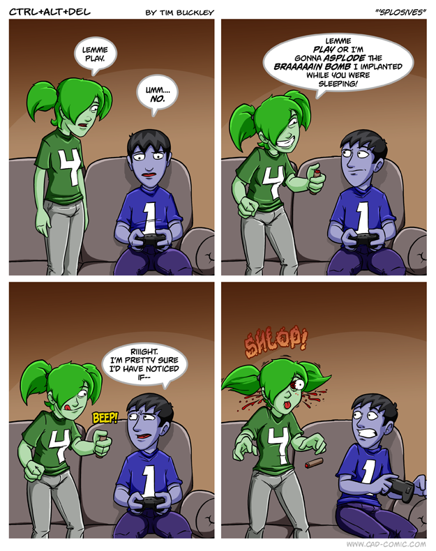 First Previous Random Next Last | 2 Share You are currently browsing the archive for Ctrl Alt Del First Previous Archive Random Next Last | 2 Share Tweet 24 ‘Splosives May 27, 2011 by Tim Subscribe Notify of new follow-up comments new replies to my comments Label {} [+] Name* Email* Δ Label {} [+] Name* Email* Δ 2 Comments Oldest Newest Most Voted Inline Feedbacks View all comments MidnightDStroyer 7 years ago Implanted while she slept? Hey, that was a pretty good trick. How’d she manage it herself? YepYepNope 7 years ago Reply to MidnightDStroyer You misunderstood, while HE (One) slept she implanted a bomb inside her OWN head, she never stated whose head she had implanted to while One was sleeping. Still imprissve.