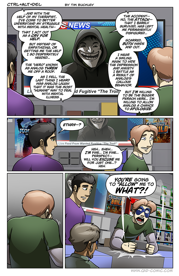It would definitely be a lot easier if Deathblood just found this guy and ended him. Cockroaches are sometimes difficult to get rid of and an exterminator is often needed. The news channel definitely should not have broadcast this before vetting it. I’m sure he just put a stream out there and they decided to pick it up and run with it. Very poor choice that they did this, but of course they only care for the ratings for being first. Lilah did hear the truth from Analog: https://cad-comic.com/comic/analog-and-d-pad-05-11/ Sadly, it wasn’t on the record, or even incidentally recorded. However,… Read more »